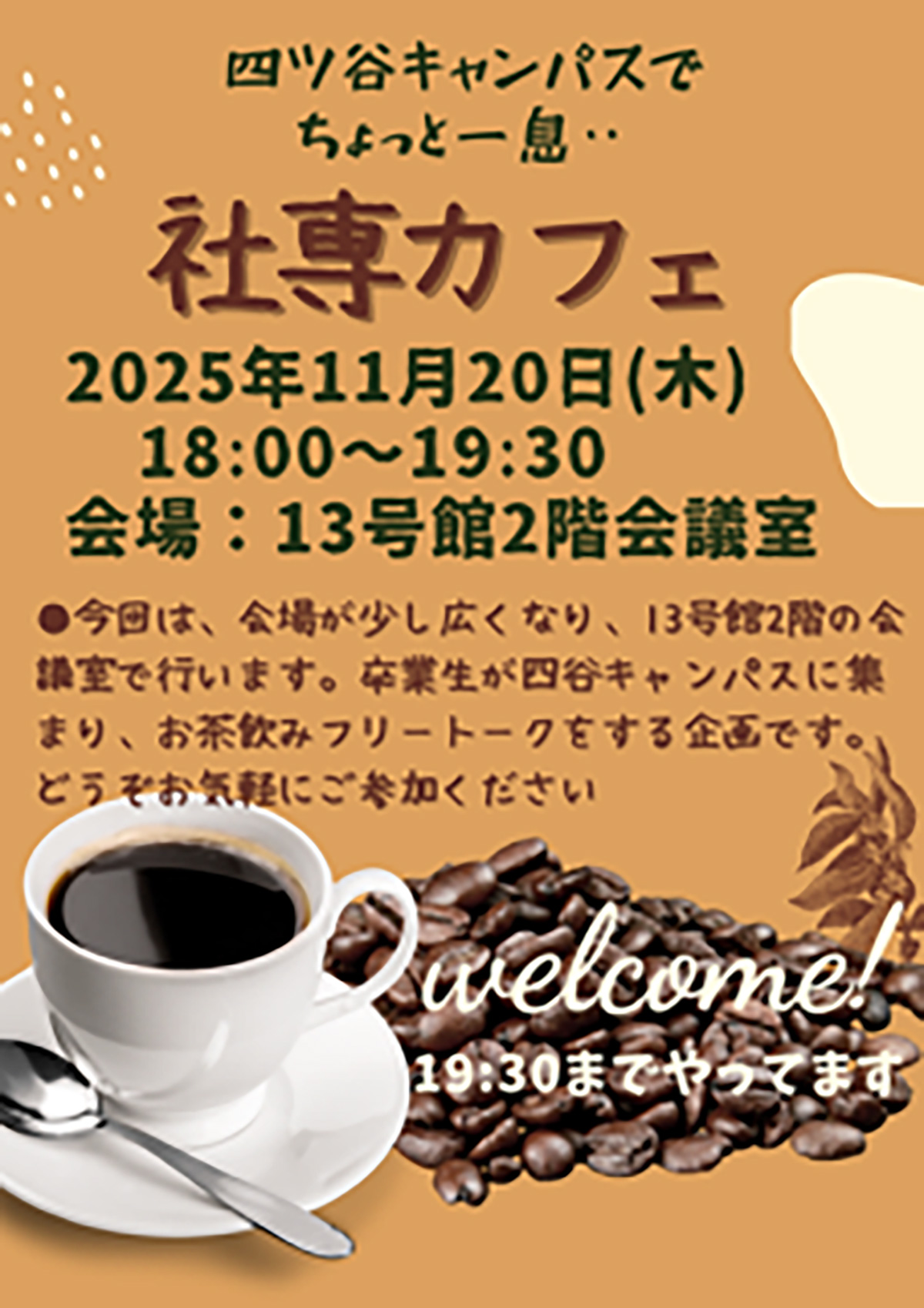 社専卒業生が気軽に情報交換や相談し合えるカフェです